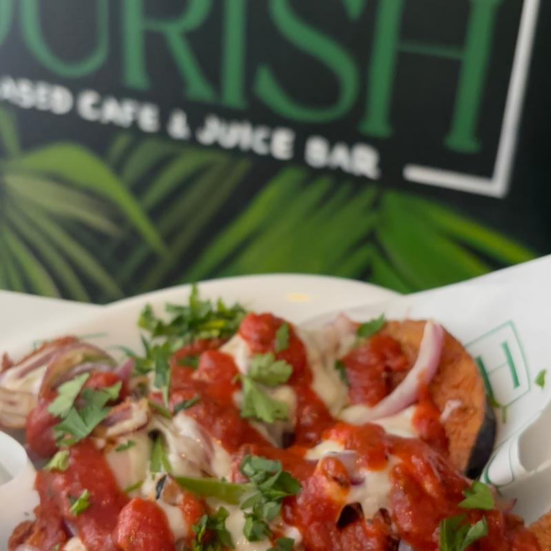 Seasoned walnut crumble served on jicama shells topped with arugula, cilantro, salsa, divine dressing and avocado, served with side of kale salad.